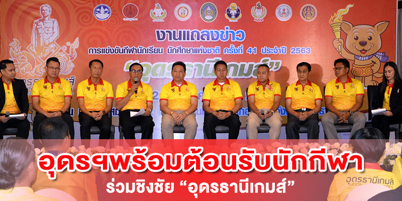นายนิรัตน์ พงษ์สิทธิถาวร ผู้ว่าราชการจังหวัดอุดรธานี นายธวัชชัย ศรีทอง รองผวจ.อุดรธานี นายวิเชียร ขาวขำ นายก อบจ.อุดรธานี นายอิทธิพนธ์ ตรีวัฒนสุวรรณ นายกเทศมนตรีนครอุดรธานี นายสุพล ยะประภา ผู้ช่วยอธิการบดี มหาวิทยาลัยการกีฬาแห่งชาติ ประจำวิทยาเขตอุดรธานี ผศ.จรูญ ถาวรจักร อธิการบดี มหาวิทยาลัยราชภัฏอุดรธานี ดร.ธนดร พุทธรักษ์ นายกสมาคมกีฬาแห่งจังหวัดอุดรธานี และนายวิรชน ประดับศรี ผู้อำนวยการ กกท.อุดรธานี ร่วมแถลงข่าว ความพร้อมของการเป็นเจ้าภาพจัดแข่งขันกีฬานักเรียนนักศึกษาแห่งชาติ ครั้งที่ ๔๑ ประจำปี ๒๕๖๓ “อุดรธานีเกมส์” เมื่อวันที่ ๒๐ มกราคม ๒๕๖๓ ที่โรงแรมเซนทารา อุดรธานี