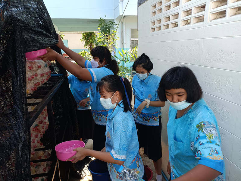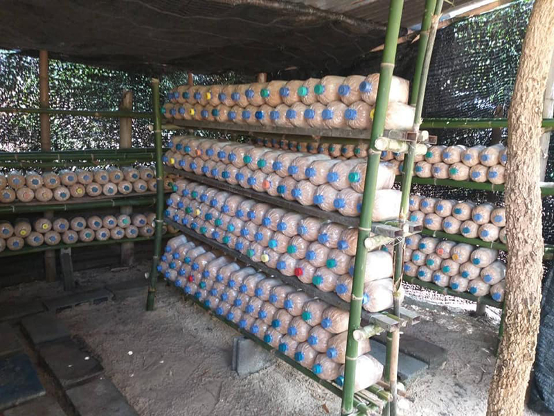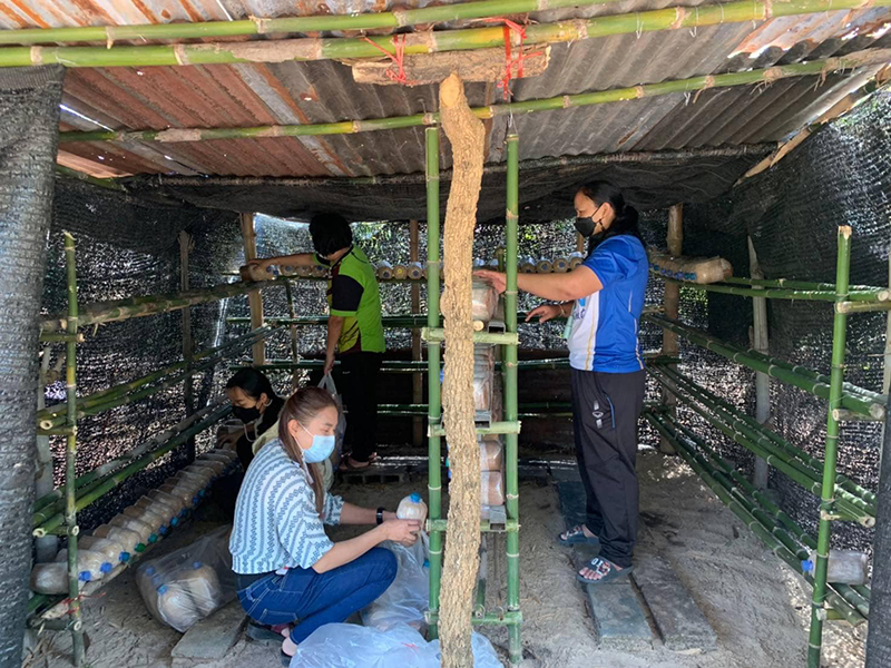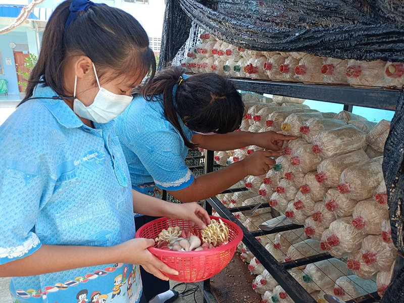 โรงเรียนฯ เริ่มต้นโครงการเมื่อปลายปี ๒๕๖๔ สร้างโรงเรือนขนาดย่อมเพื่อเพาะเห็ดนางฟ้า ๔๐๐ ก้อน มีคุณครูประจำหอนอนและเด็กๆ ที่หอนอน ช่วยกันดูแลเห็ดที่เพาะไว้ รดน้ำ เก็บดอกเห็ดเสร็จทำความสะอาดหน้าก้อนเชื้อ นำผลผลิตเห็ดที่เก็บได้ชั่งกิโลกรัม เพื่อส่งให้โรงอาหารประกอบอาหารกลางวันให้นักเรียนสัปดาห์ละ ๑-๒ ครั้ง ขึ้นกับรายการอาหารแต่ละสัปดาห์ อาทิ ต้มยำไก่ใส่เห็ด ผัดกะเพราหมูใส่เห็ด ต้มข่าไก่ ช่วยลดค่าใช้จ่ายในการซื้อวัตถุดิบในการประกอบอาหารกลางวัน ที่สำคัญคือ ผลผลิตเห็ดที่เด็กๆ ช่วยกันดูแลเป็นวัตถุดิบต้นทางที่สะอาด ปลอดภัย ไร้สารเคมี ๑๐๐%