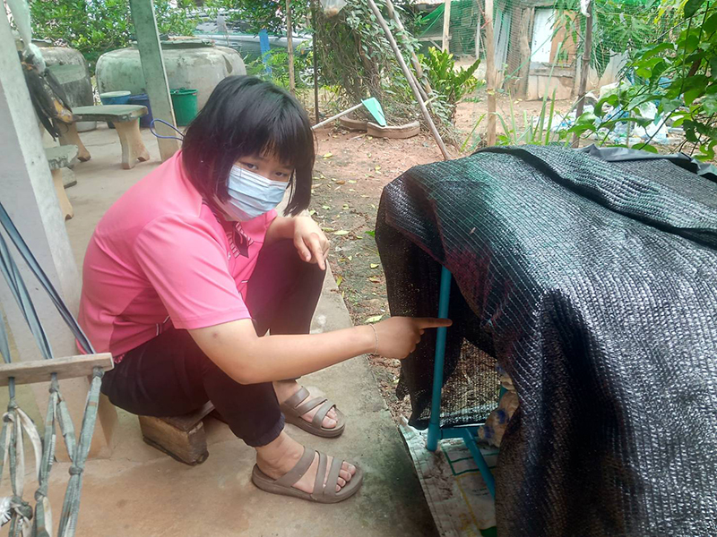 เรวดี เกสรอินทร์ ผู้ปกครองน้องสตางค์ ซึ่งกำลังศึกษาอยู่ชั้น ม.๑ เป็นเด็กออทิสติก เล่าว่าตื่นเช้ามา หลังจากที่น้องสตางค์ทำกิจวัตรประจำวันแล้ว ก็จะมาตามคุณแม่ไปดูคอนโดเห็ดเพื่อไปรดน้ำเห็ดในตอนเช้า สตางค์สามารถรดน้ำเห็ดได้เองบางวันถ้าน้องอารมณ์ดีก็จะได้ยินน้องรดน้ำและร้องเพลงไปด้วย คุณแม่เล่าว่า เริ่มต้นที่โรงเรียนมอบคอนโดเห็ดมาให้น้องดูแล ยังแบ่งเวลาไม่ถูกเพราะน้องมีภารกิจประจำวันช่วยงานซักผ้า ตากผ้า กรอกน้ำ แต่เมื่อเริ่มลงตัวแล้ว น้องเริ่มแบ่งเวลาเองได้ เช้ารดน้ำเห็ด จากนั้นทำภารกิจช่วยที่บ้าน พอใกล้ถึงเวลาเย็น น้องสตางค์ ก็จะมาเตือนคุณแม่ “รด รด” ชวนไปรดน้ำเห็ดอีกครั้งในช่วงเย็น ตอนนี้เห็ดเริ่มออกผลผลิต เป็นตุ่มๆ โผล่ออกมา น้องก็จะบอกคุณแม่ “เก็บ เก็บ” หรือในการสื่อสารทางไลน์กลุ่มกับคุณครู และผู้ปกครองท่านอื่นๆ เวลามีรูปที่ผู้ปกครองส่งเข้ามา คุณแม่จะหันไปบอกน้องสตางค์ว่า “เพื่อนๆทักไลน์มาแล้ว” น้องสตางค์ก็จะบอกคุณแม่ว่า “ส่ง ส่ง” ซึ่งหมายถึงให้คุณแม่ส่งรูปที่น้องสตางค์รดน้ำเห็ดเข้าไปในกลุ่มไลน์ด้วย
