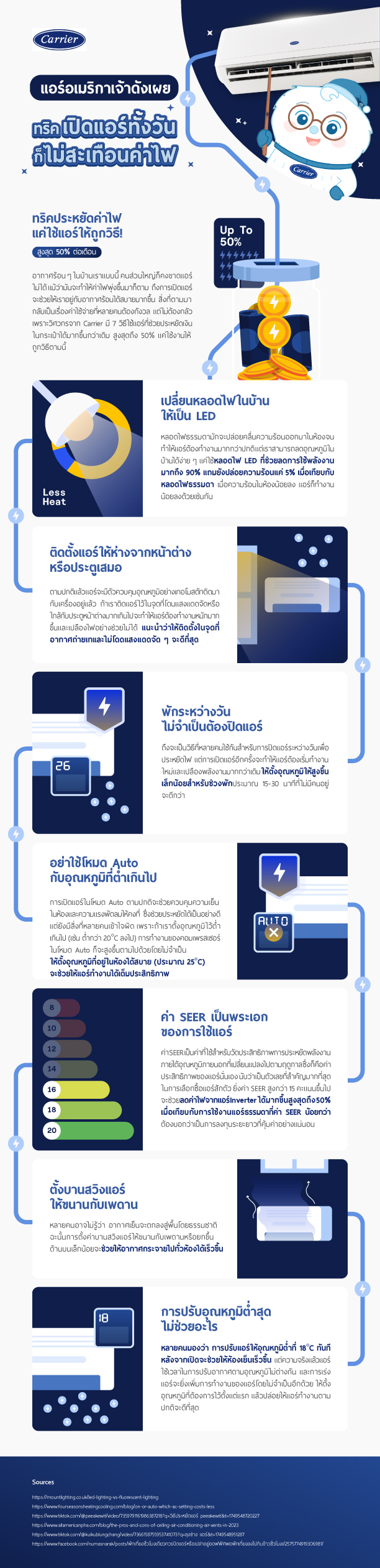 แอร์ถือว่าเป็นผู้ช่วยสำคัญในวันที่อากาศร้อนจัด แต่ก็เป็นหนึ่งในเครื่องใช้ที่กินไฟไม่น้อยเลยทีเดียว หากใช้ไม่ถูกวิธี อาจต้องจ่ายค่าไฟเกินจำเป็น วันนี้ Carrier จึงรวบรวม 7 เทคนิคจากทีมวิศวกรผู้เชี่ยวชาญ ที่จะช่วยให้คุณใช้แอร์อย่างมีประสิทธิภาพมากขึ้น เย็นสบายแบบรักษ์โลก พร้อมลดค่าใช้จ่ายได้สูงสุดถึง 50% เหมาะสำหรับบ้านยุคใหม่ที่ใส่ใจทั้งความสบายและความยั่งยืนอีกด้วย