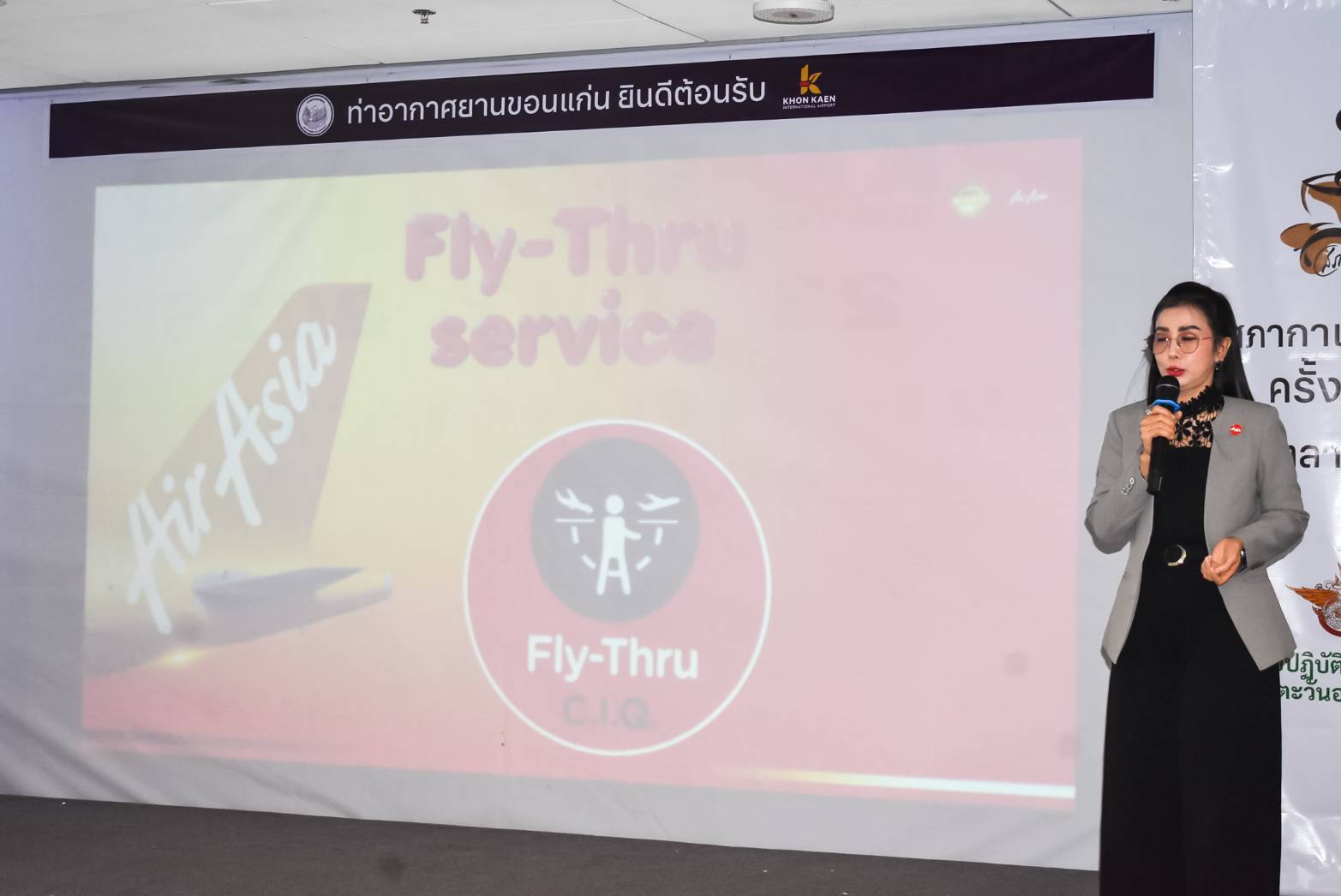 "อย่างไรก็ตาม สำหรับการบินแบบฟลายทรู (Fly-Thru) ระหว่างประเทศ เป็นบริการเชื่อมต่อเที่ยวบินของ AirAsia ที่จองเที่ยวบิน 2 ช่วงหรือมากกว่าภายใต้รหัสจองเดียว โดยผู้โดยสารไม่ต้องไปรับกระเป๋า, เช็กอินใหม่, ผ่านด่านตรวจคนเข้าเมืองที่จุดแวะ (transit hub) กระเป๋าที่โหลดใต้เครื่องจะถูกส่งถึงปลายทางสุดท้าย ผู้โดยสารไม่ต้องเข้า–ออกเขตผู้โดยสาร หรือผ่านด่านคนเข้าเมืองในจุดแวะ ทั้งนี้สามารถสอบถามรายละเอียดและขั้นตอนการใช้บริการได้ที่สายการบินฯ ที่ต้องการเดินทางในช่วงเวลาที่กำหนด" ผู้อำนวยการท่าอากาศยานขอนแก่น กล่าว
