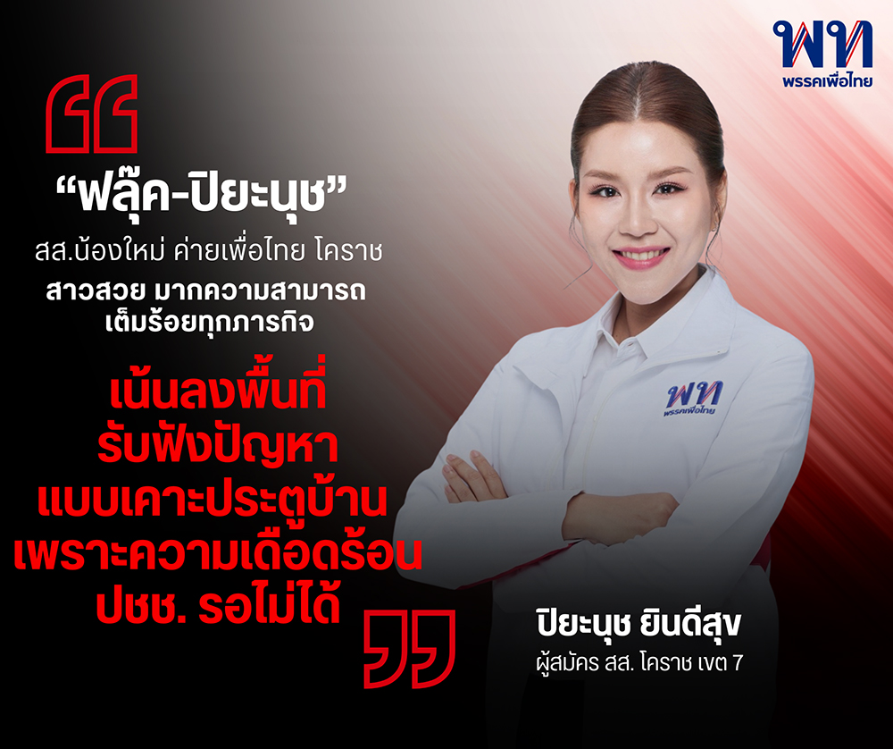 “ฟลุ๊ค-ปิยะนุช” สส.น้องใหม่เพื่อไทยโคราช สาวสวยมากความสามารถ เต็มร้อยทุกภารกิจ เน้นลงพื้นที่รับฟังปัญหาแบบเคาะประตูบ้าน เพราะความเดือดร้อนประชาชนรอไม่ได้