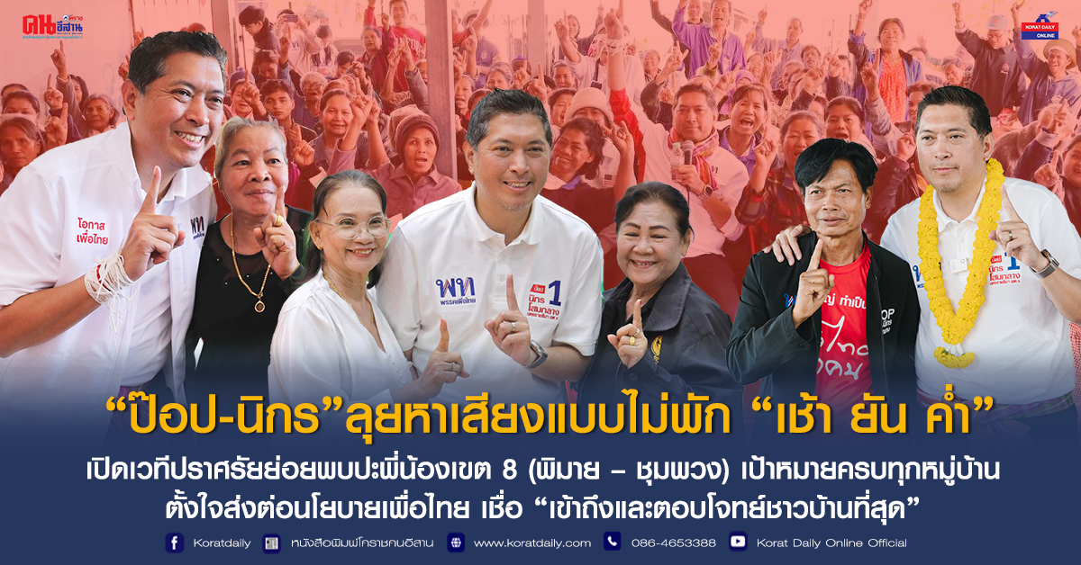 “ป๊อป-นิกร”ลุยหาเสียงแบบไม่พัก “เช้า ยัน ค่ำ” เปิดเวทีปราศรัยย่อยพบปะพี่น้องเขต 8 (พิมาย – ชุมพวง) เป้าหมายครบทุกหมู่บ้าน ตั้งใจส่งต่อนโยบายเพื่อไทย เชื่อ “เข้าถึงและตอบโจทย์ชาวบ้านที่สุด”