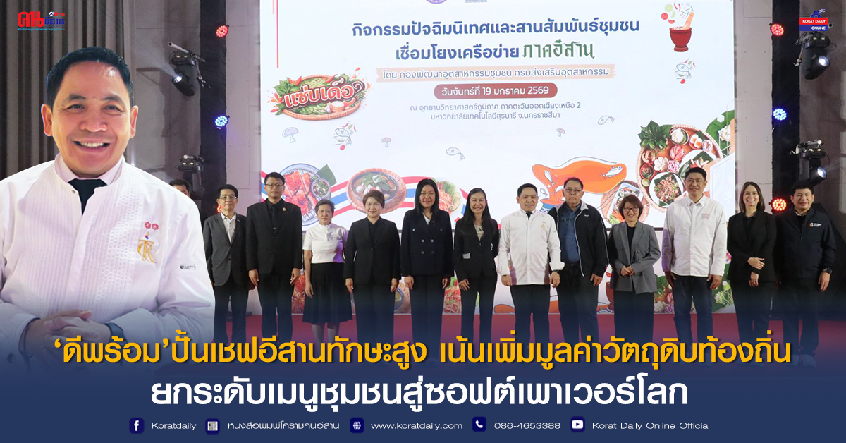 วันนี้ (19 มกราคม 2569) กรมส่งเสริมอุตสาหกรรม หรือ ดีพร้อม (DIPROM) จัดบิ๊กอีเวนต์ปิดคอร์ส Master Thai Chef “ปัจฉิมนิเทศและสานสัมพันธ์เชฟชุมชน” ณ อุทยานวิทยาศาสตร์ภาคตะวันออกเฉียงเหนือ 2 มหาวิทยาลัยเทคโนโลยีสุรนารี (มทส.) โชว์ศักยภาพเชฟไทยภาคอีสานกว่า 300 ชีวิต มุ่งยกระดับผลักดันเมนูไทย ประกาศศักดา Soft Power ไทยบนเวทีโลกอย่างยั่งยืน โดยมีนางสาวสุวิมล จินตวัฒน์ ผู้อำนวยการศูนย์ส่งเสริมอุตสาหกรรมภาคที่ 6 กรมส่งเสริมอุตสาหกรรม เป็นประธานเปิดกิจกรรมปัจฉิมนิเทศและสานสัมพันธ์ชุมชน ครั้งที่ 4 เชื่อมโยงเครือข่าย ภาคตะวันออกเฉียงเหนือ โดยมี ดร.ปริยะดา วิสุทธิแพทย์ รองผู้ว่าการบริหารสถาบันวิจัยวิทยาศาสตร์และเทคโนโลยีแห่งประเทศไทย (วว.) ผศ.ดร.ปภากร พิทยชวาล ผู้อำนวยการอุทยานวิทยาศาสตร์ภูมิภาค ภาคตะวันออกเฉียงเหนือ 2 มหาวิทยาลัยสุรนารี และหัวหน้าหน่วยวิจัยนโยบายวิทยาศาสตร์ เทคโนโลยี และนวัตกรรม มทส. และผู้แทนหน่วยงานที่เกี่ยวข้อง เข้าร่วม