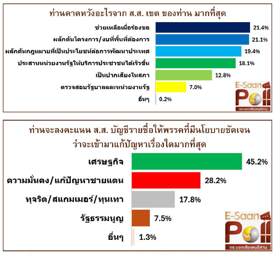 เมื่อสอบถามว่า ท่านคาดหวังอะไรจาก ส.ส.เขตของท่าน มากที่สุด พบว่า อันดับหนึ่ง ร้อยละ 21.4 ช่วยเหลือเมื่อร้องขอ รองลงมา ร้อยละ 21.1 ผลักดันโครงการ/งบที่พื้นที่ต้องการ อันดับสาม ร้อยละ 19.4 ผลักดันกฎหมายที่เป็นประโยชน์ต่อการพัฒนาประเทศ อันดับสี่ ร้อยละ 18.1 ประสานหน่วยงานรัฐให้บริการประชาชนได้เร็วขึ้น อันดับห้า ร้อยละ 12.8 เป็นปากเสียงในสภา อันดับหก ร้อยละ 7.0 ตรวจสอบรัฐบาลและหน่วยงานรัฐ และร้อยละ 0.2 อื่นๆ