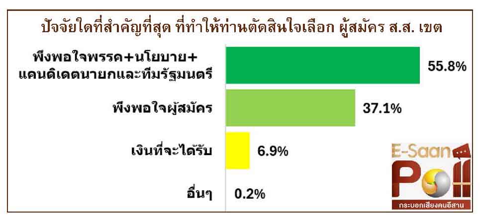 เมื่อสอบถามว่า ปัจจัยใดที่สาคัญที่สุด ที่ทำให้ท่านตัดสินใจเลือก ผู้สมัคร ส.ส.เขต พบว่า อันดับหนึ่ง ร้อยละ 55.8 พึงพอใจพรรค นโยบาย แคนดิเดตนายกและทีมรัฐมนตรีของพรรค รองลงมา ร้อยละ 37.1 พึงพอใจผู้สมัคร ขณะที่ ร้อยละ 6.9 ระบุว่า ขึ้นกับเงินที่จะได้รับ และร้อยละ 0.2 เป็นเหตุผลอื่นๆ