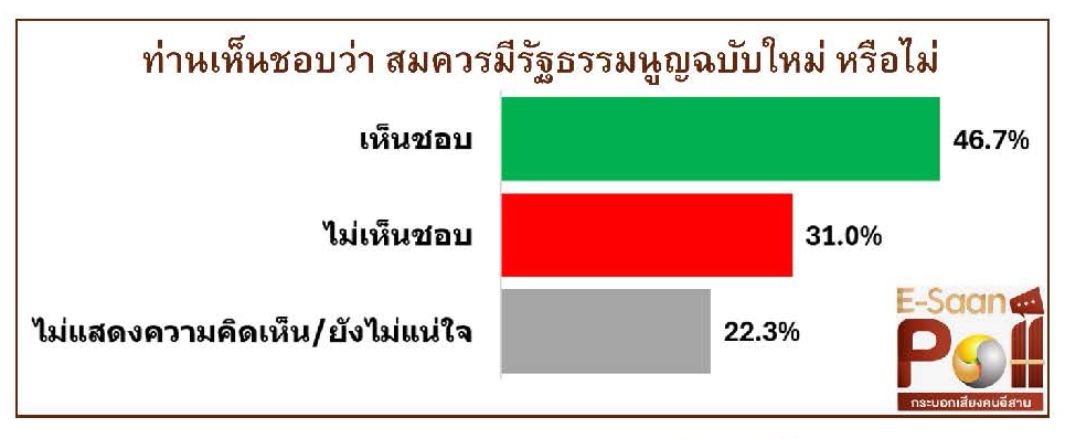 เมื่อสอบถามว่า ท่านเห็นชอบว่า สมควรมีรัฐธรรมนูญฉบับใหม่ หรือไม่ พบว่า อันดับหนึ่ง ร้อยละ 46.7 ตอบว่า เห็นชอบ อันดับสอง ร้อยละ 31.0 ตอบว่า ไม่เห็นชอบ อันดับสาม ร้อยละ 22.3 ตอบว่า ไม่แสดงความคิดเห็น/ยังไม่แน่ใจ