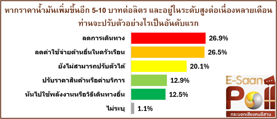 เมื่อสอบถามว่า หากราคาน้ำมันเพิ่มขึ้นอีก 5 – 10 บาทต่อลิตร และอยู่ในระดับสูงต่อเนื่องหลายเดือน จะปรับตัวอย่างไรเป็นอันดับแรก พบว่า อันดับหนึ่ง ร้อยละ 26.9 ตอบว่าจะลดการเดินทางรองลงมา ร้อยละ 26.5 จะลดค่าใช้จ่ายด้านอื่นในครัวเรือน อันดับสาม ร้อยละ 20.1 ยังไม่สามารถปรับตัวได้ อันดับสี่ ร้อยละ 12.9 ปรับราคาสินค้าหรือค่าบริการ อันดับห้า ร้อยละ 12.5 หันไปใช้พลังงานหรือวิธีเดินทางอื่น และร้อยละ 1.1 ไม่ระบุ
