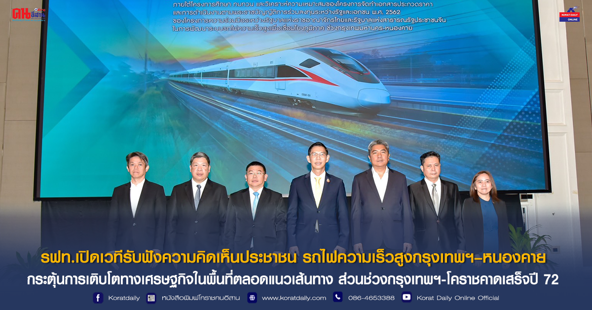 รฟท.เปิดเวทีรับฟังความคิดเห็นประชาชน รถไฟความเร็วสูงกรุงเทพฯ–หนองคาย กระตุ้นการเติบโตทางเศรษฐกิจในพื้นที่ตลอดแนวเส้นทาง ส่วนช่วงกรุงเทพฯ-โคราชคาดเสร็จปี 72
