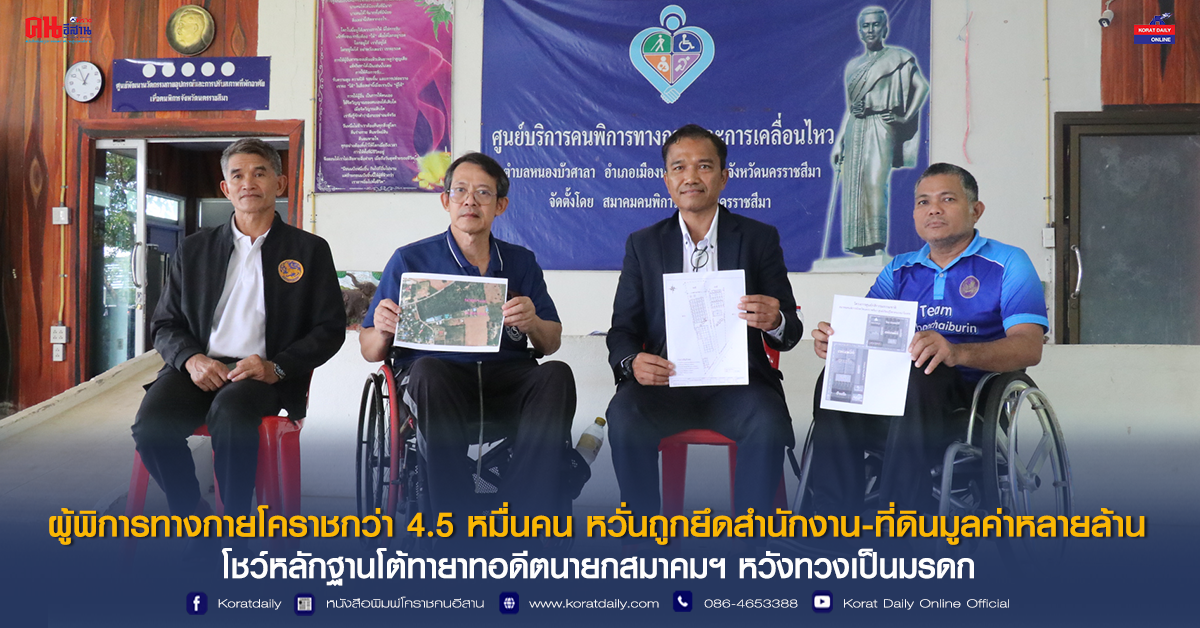 ผู้พิการทางกายโคราชกว่า 4.5 หมื่นคน หวั่นถูกยึดสำนักงาน-ที่ดินมูลค่าหลายล้าน โชว์หลักฐานโต้ทายาทอดีตนายกสมาคมฯ หวังทวงเป็นมรดก