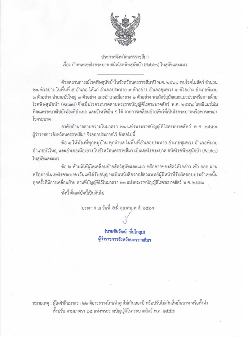 เมื่อวันที่ 14 ตุลาคม 2568 นายชัยวัฒน์ ชื่นโกสุม ผู้ว่าราชการจังหวัดนครราชสีมา ได้ออกประกาศจังหวัดนครราชสีมา เรื่อง กำหนดเขตโรคระบาด ชนิดโรคพิษสุนัขบ้า (Rabies) ในสุนัขและแมว ด้วยสถานการณ์โรคพิษสุนัขบ้าในจังหวัดนครราชสีมาปี พ.ศ. 2568 พบโรคในสัตว์ จำนวน 21 ตัวอย่าง ในพื้นที่ 5 อำเภอ ได้แก่ อำเภอประทาย 9 ตัวอย่าง อำเภอชุมพวง 4 ตัวอย่าง อำเภอพิมาย 3 ตัวอย่าง อำเภอบัวใหญ่ 3 ตัวอย่าง และอำเภอเมืองยาง 2 ตัวอย่าง พบสัตว์สุนัขและแมวป่วยหรือตายด้วย โรคพิษสุนัขบ้า (Rabies) ซึ่งเป็นโรคระบาดตามพระราชบัญญัติโรคระบาดสัตว์ พ.ศ. 2558 โดยมีแนวโน้ม ที่จะแพร่ระบาดไปยังท้องที่อำเภอ และจังหวัดอื่น ๆ ได้ จากการเคลื่อนย้ายสัตว์ที่เป็นโรคระบาดหรือพาหะของโรคระบาด