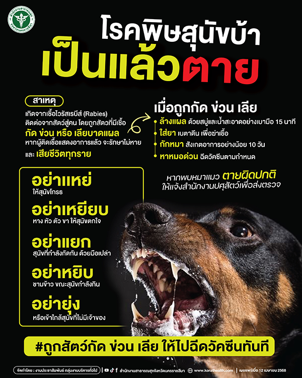 อนึ่ง ในช่วงเดือนเมษายน-มิถุนายน 2568 มีผู้เสียชีวิตจากโรคพิษสุนัขบ้าแล้ว 2 รายในพื้นที่อำเภอประทาย จ.นครราชสีมา ได้แก่ ชายอายุ 51 ปี มีประวัติถูกหมากัดที่ขาไม่ได้รับวัคซีนและไม่สามารถระบุตัวสุนัขที่กัดได้ และหญิงอายุ 40 ปี ชาวบ้านดอนตะหนิน ต.หนองค่าย มีประวัติถูกสุนัขข่วน