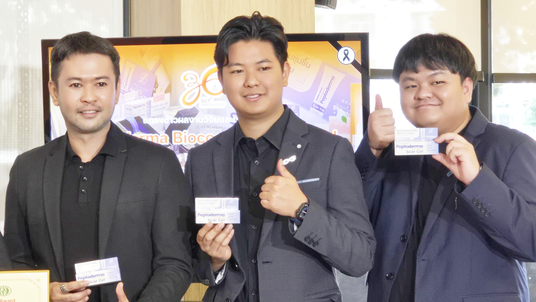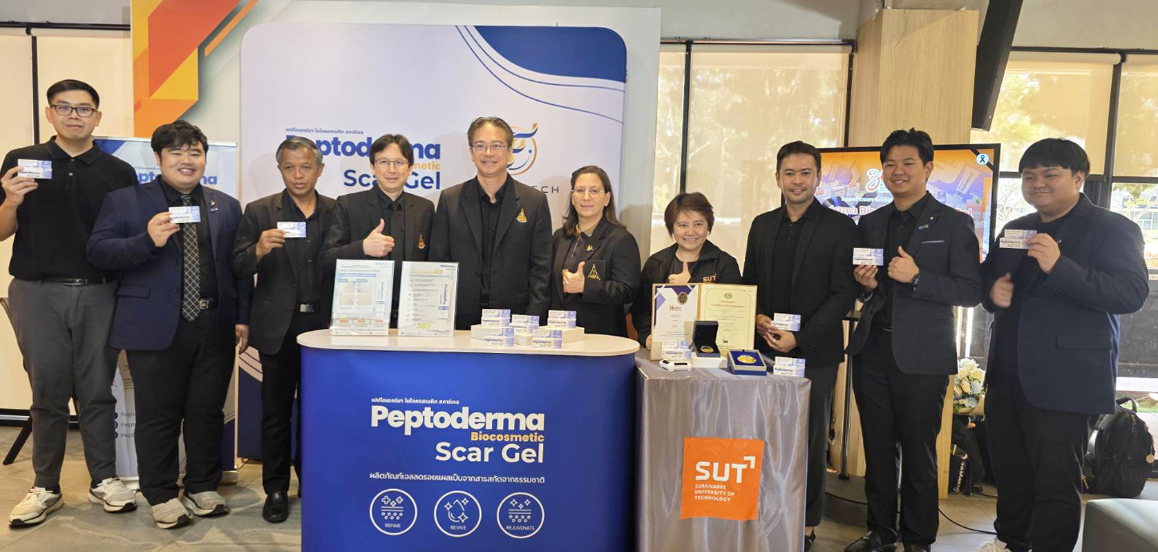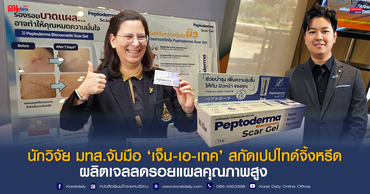มหาวิทยาลัยเทคโนโลยีสุรนารี (มทส.) ร่วมกับทีมสตาร์ทอัพ เจ็น-เอ-เทค เปิดตัวผลงานวิจัยและนวัตกรรม “Peptoderma Biocosmetic Scar Gel” หรือ “เปปโตเดอร์มา ไบโอคอสเมติก สการ์เจล” เจลลดรอยแผลเป็นที่พัฒนาจากเปปไทด์ชีวภาพจิ้งหรีดไทย พบคุณสมบัติช่วยลดการอักเสบ กระตุ้นการสร้างคอลลาเจน เร่งการฟื้นฟูผิวอย่างมีประสิทธิภาพ ยับยั้งการเจริญเติบโตของแบคทีเรีย เหมาะสำหรับผิวบอบบางแพ้ง่าย ด้วยคุณสมบัติที่พิเศษหลากหลาย สามารถต่อยอดเป็นนวัตกรรมเวชสำอางมีศักยภาพเชิงพาณิชย์สูง ในตลาดระดับประเทศและนานาชาติได้ในอนาคต