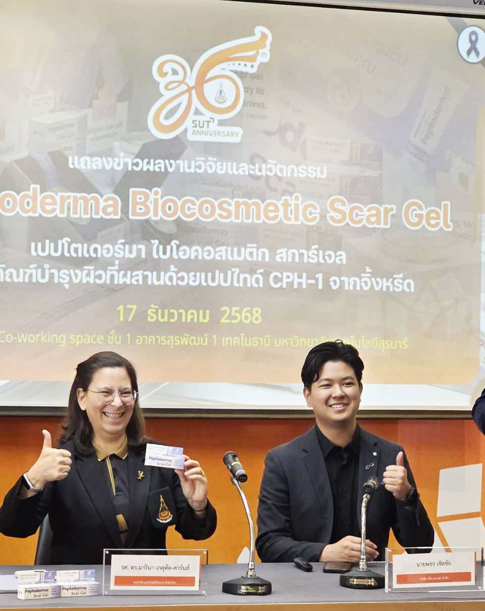 เมื่อวันที่ 17 ธันวาคม 2568 ณ ห้อง Co-working space เทคโนธานี มทส. รองศาสตราจารย์ ดร.สิทธิชัย แสงอาทิตย์ รักษาการแทนอธิการบดี เป็นประธานเปิดการแถลงข่าวผลงานวิจัยและนวัตกรรม “Peptoderma Biocosmetic Scar Gel” ร่วมกับ รองศาสตราจารย์ ดร.มารินา เกตุทัต-คาร์นส์ อาจารย์ประจำสาขาวิชาเทคโนโลยีชีวภาพ สำนักวิชาเทคโนโลยีการเกษตร มทส. และทีมสตาร์อัพ บริษัท เจ็น-เอ-เทค จำกัด ผู้รับการถ่ายทอดเทคโนโลยีพัฒนาผลิตภัณฑ์สู่เชิงพาณิชย์ อธิการบดี มทส. กล่าวว่า มทส. กล่าวว่า “มหาวิทยาลัยมีนโยบายสนับสนุนผลักดันสร้างสรรงานวิจัยไปสู่การใช้ประโยชน์จริง บนพื้นฐานการบูรณาการองค์ความรู้ทางวิชาการที่ตอบโจทย์ปัญหาความต้องการของประเทศ โดยเฉพาะในด้านเศรษฐกิจฐานนวัตกรรม ซึ่งที่น่าภูมิใจยิ่งคือเป็นนวัตกรรมที่สกัดสารธรรมชาติจากจิ้งหรีดของไทย จากห้องปฏิบัติการทดลองนักวิจัยค้นพบคุณสมบัติพิเศษต่างๆ มากมาย กระทั่งสามารถ Spin off สู่การเป็น Strat up ซึ่งถือได้ว่า เป็นผลสำเร็จด้านหนึ่งของนักวิจัยที่สามารถนำผลงาน “จากหิ้ง ลงสู่ห้าง” สู่ท้องตลาดเชิงพาณิชย์ได้อย่างแท้จริง นอกจากจะเป็นการเพิ่มศักยภาพของนักวิจัยและเพิ่มมูลค่าผลิตภัณฑ์จากธรรมชาติแล้ว ยังสร้างโอกาสในการแข่งขันของผลิตภัณฑ์ไทยในตลาดเวชสำอางระดับสากลอีกด้วย สิ่งนี้คือบทบาทที่ มทส. ยึดถือในการเป็นมหาวิทยาลัยที่ผลิตความรู้เพื่อสร้างพลังขับเคลื่อนเศรษฐกิจของประเทศ ในฐานะ “มหาวิทยาลัยรับใช้และเป็นที่พึ่งพิงได้ของสังคม”