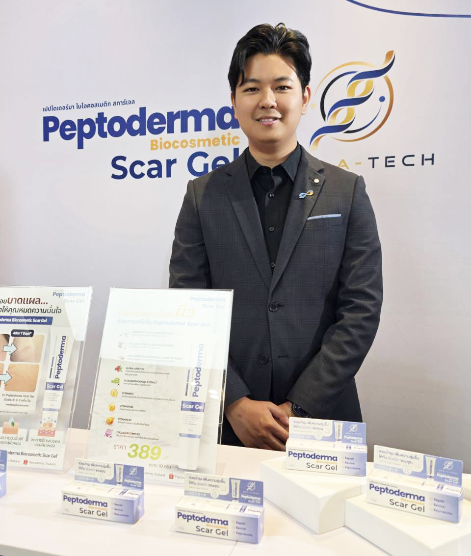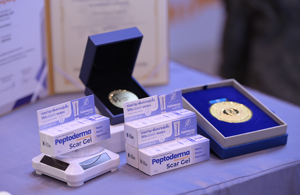 นายพชร เชิดชัย หนึ่งในทีมสตาร์ทอัพ บริษัท เจ็น-เอ-เทค จำกัด ผู้รับการถ่ายทอดเทคโนโลยีกล่าวว่า “ผลิตภัณฑ์ Peptoderma Biocosmetic Scar Gel เป็นนวัตกรรมเด่นที่ค้นพบว่า โปรตีนในจิ้งหรีด เมื่อผ่านกระบวนการสกัดและย่อยด้วยกระบวนการทางเทคโนโลยีชีวภาพ จะให้เปปไทด์ออกฤทธิ์ทางชีวภาพ (Bioactive Peptide) ซึ่งมีคุณสมบัติสำคัญต่อการฟื้นฟูผิว ได้แก่ การกระตุ้นการสร้างคอลลาเจนใหม่ การลดการอักเสบของผิว และช่วยให้กระบวนการสมานแผลเกิดขึ้นอย่างมีประสิทธิภาพมากขึ้น อีกทั้งยังมีคุณสมบัติในการต้านจุลชีพ ส่งผลให้รอยแผลเป็นค่อยๆ จางลง เนื้อเจลถูกออกแบบให้บางเบา ซึมซาบง่าย และไม่เหนอะหนะ คงความเสถียรของเปปไทด์ได้เป็นอย่างดี ทำให้เป็นผลิตภัณฑ์ที่เหมาะกับผิวแพ้ง่ายและการใช้งานในระยะยาว บริษัทได้ร่วมกันพัฒนาระบบผลิต การควบคุมคุณภาพ และการขยายตลาด เชื่อมั่นว่า การใช้เปปไทด์จากจิ้งหรีด ซึ่งเป็นวัตถุดิบธรรมชาติของไทย เพิ่มมูลค่าผลิตภัณฑ์ทางการเกษตรอย่างมหาศาล สร้างอาชีพ และสร้างรายได้ให้แก่เกษตรกรผู้สนใจอีกทางหนึ่งด้วย”