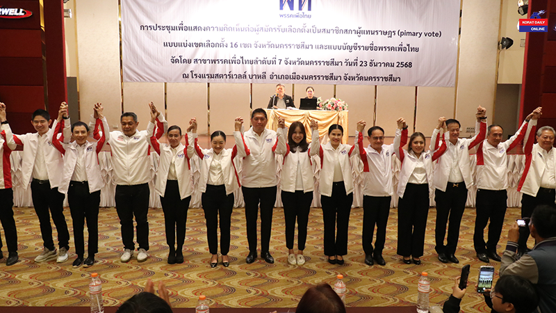 วันนี้ (23 ธันวาคม 2568) ที่โรงแรมสตาร์เวลล์บาหลี อ.เมือง จ.นครiาชสีมา นางสาวสุดาวรรณ หวังศุภกิจโกศล (ปุ๋ง) อดีต รมว.อุดมศึกษา วิทยาศาสตร์ วิจัยและนวัตกรรม, อดีต รมว.วัฒนธรรม และอดีต รมว.การท่องเที่ยวและกีฬา ในฐานะรองหัวหน้าพรรคเพื่อไทย (พท.) พร้อมด้วย นายภุชพงศ์ ทองพันภิญโญ หัวหน้าสาขาพรรคเพื่อไทย ลำดับที่ 7 จ.นครราชสีมา จัดประชุมขอรับฟังความคิดเห็นและความเห็นชอบต่อผู้สมัครรับเลือกตั้งเป็น ส.ส. (Pimary Vote) แบบบัญชีรายชื่อจำนวน 100 คน และแบ่งเขตเลือกตั้ง 16 เขต จ.นครราชสีมา ประกอบด้วย เขต 1 นายประเสริฐ บุญชัยสุข ทีมชาติพัฒนา อดีต รมว.อุตสาหกรรม, เขต 2 นายวัชรพล โตมรศักดิ์ ทีมชาติพัฒนา อดีต ส.ส.หลายสมัย, เขต 3 นายสมบัติ กาญจนวัฒนา อดีตประธานสภาองค์การบริหารส่วนจังหวัด (อบจ.) นครราชสีมา, เขต 4 นางสาวณัฐจิรา (เม) อิ่มวิเศษ อดีต ส.ส.สมัยที่ผ่านมา, เขต 5 นายสมเกียรติ ตันดิลกตระกูล อดีต ส.ส.สมัยที่ผ่านมา, เขต 6 นางพัชราวรรณ ภิญโญ (สจ.ปอ) อดีต ส.อบจ.นครราชสีมา เขตอำเภอแก้งสนามนาง, เขต 7 นางสาวปิยะนุช ยินดีสุข อดีตส.ส.สมัยที่ผ่านมา, เขต 8 นายนิกร โสมกลาง อดีตส.ส.สมัยที่ผ่านมา, เขต 9 นางนารดา อึ้งสวัสดิ์ อดีต ส.อบจ.เขตอำเภอชุมพวง, เขต 10 นายอภิชา เลิศพชรกมล อดีต ส.ส., เขต 11 นายอาทิตย์ หวังศุภกิจโกศล อดีต ส.ส.สมัยที่ผ่านมา, เขต 12 นายนรเสฏฐ์ ศิริโรจนกุล อดีต ส.ส.สมัยที่ผ่านมา, เขต 13 นายพชร จันทรรวงทอง อดีตส.ส.สมัยที่ผ่านมา และลูกชายนายประเสริฐ จันทรรวงทอง อดีตรองนายกรัฐมนตรี, เขต 14 นายวัชรากร เลิศด้วยลาภ ลูกชายอดีต ส.ส.นายศิรสิทธิ์ เลิศด้วยลาภ, เขต 15 นายรชตะ ด่านกุล อดีต ส.ส.สมัยที่ผ่านมา และเขต 16 นายพรเทพ ศิริโรจนกุล อดีต ส.ส.สมัยที่ผ่านมา