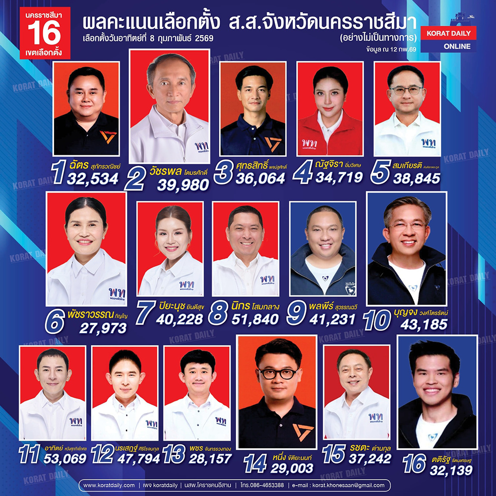 อย่างไรก็ตาม ในส่วนของจังหวัดนครราชสีมาซึ่งมี 16 เขตเลือกตั้ง สส. 16 คน ผ่านการรับรองของ กกต.ทั้งหมด ประกอบด้วย