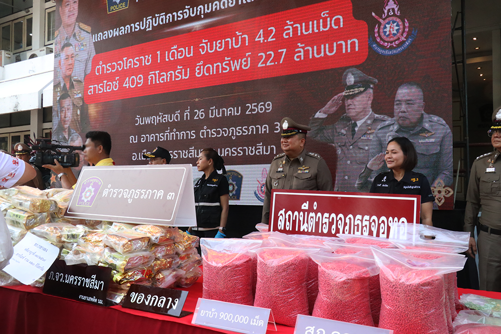 วันที่ 26 มีนาคม 2569 เวลา 09.30 น.ที่บริเวณหน้าสำนักงานตำรวจภูธรภาค 3 นครราชสีมา พล.ต.ท.พฤทธิพงษ์ ประยูรศิริ ผบช.ภาค 3 พร้อม พล.ต.ต.ชูสวัสดิ์ จันทร์โรจนกิจ รอง ผบช.ภาค 3 ในฐานะรับผิดชอบงานยาเสพติด ได้ขับเคลื่อนนโยบายสู่การปฏิบัติอโดยบูรณาการะหว่างกองบังคับการสืบสวนสอบสวนตำรวจภูธรภาค 3 และ ตำรวจภูธรจังหวัดนครราชสีมา นำโดย พล.ต.ต.ณรงค์ศักดิ์ พรหมทา ผบก.ภ.จ.นครราชสีมา พ.ต.อ.คเชนท์ เสตะปุตตะ รอง ผบก.ภ.จ.นครราชสีมา และฝ่ายปกครอง, กองทัพภาคที่ 2, ป.ป.ส.ภาค 3 และสำนักงานสาธารณสุขจังหวัดนครราชสีมา สามารถทลายเครือข่ายค้ายารวม 10 กลุ่ม จับกุมผู้ต้องหารวม 22 คน พร้อมยึดยาบ้าของกลาง 4,279,685 เม็ด ยาไอซ์ 409 กิโลกรัม และทรัพย์สินรวมมูลค่ากว่า 22.7 ล้านบาท
