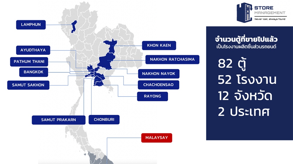 บริษัท สโตร์ เมเนจเมนท์ จำกัด เป็นผู้ประกอบธุรกิจด้านการวิจัย พัฒนา และจัดจำหน่ายเครื่องจักรอุตสาหกรรม อุปกรณ์ และชิ้นส่วนอุตสาหกรรมทั้งในและต่างประเทศ โดยมีประสบการณ์ด้านการพัฒนาระบบ Tool Management System และโปรแกรมบริหารจัดการคลังสินค้ามากกว่า 10 ปี ปัจจุบันบริษัทได้พัฒนาและจำหน่ายระบบบริหารจัดการเครื่องมือตัดเฉือนโลหะแบบครบวงจรไปแล้วกว่า 82 ตู้ ครอบคลุม 52 โรงงาน ทั้งในประเทศไทยและประเทศมาเลเซีย ผ่านเครือข่ายพันธมิตรทางธุรกิจ