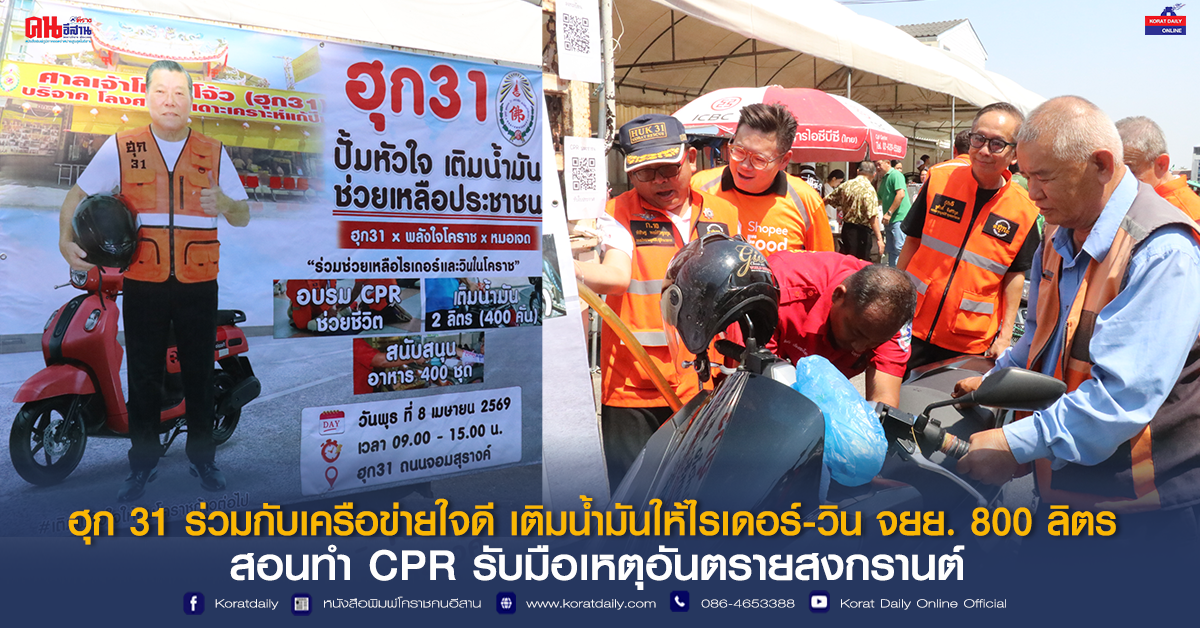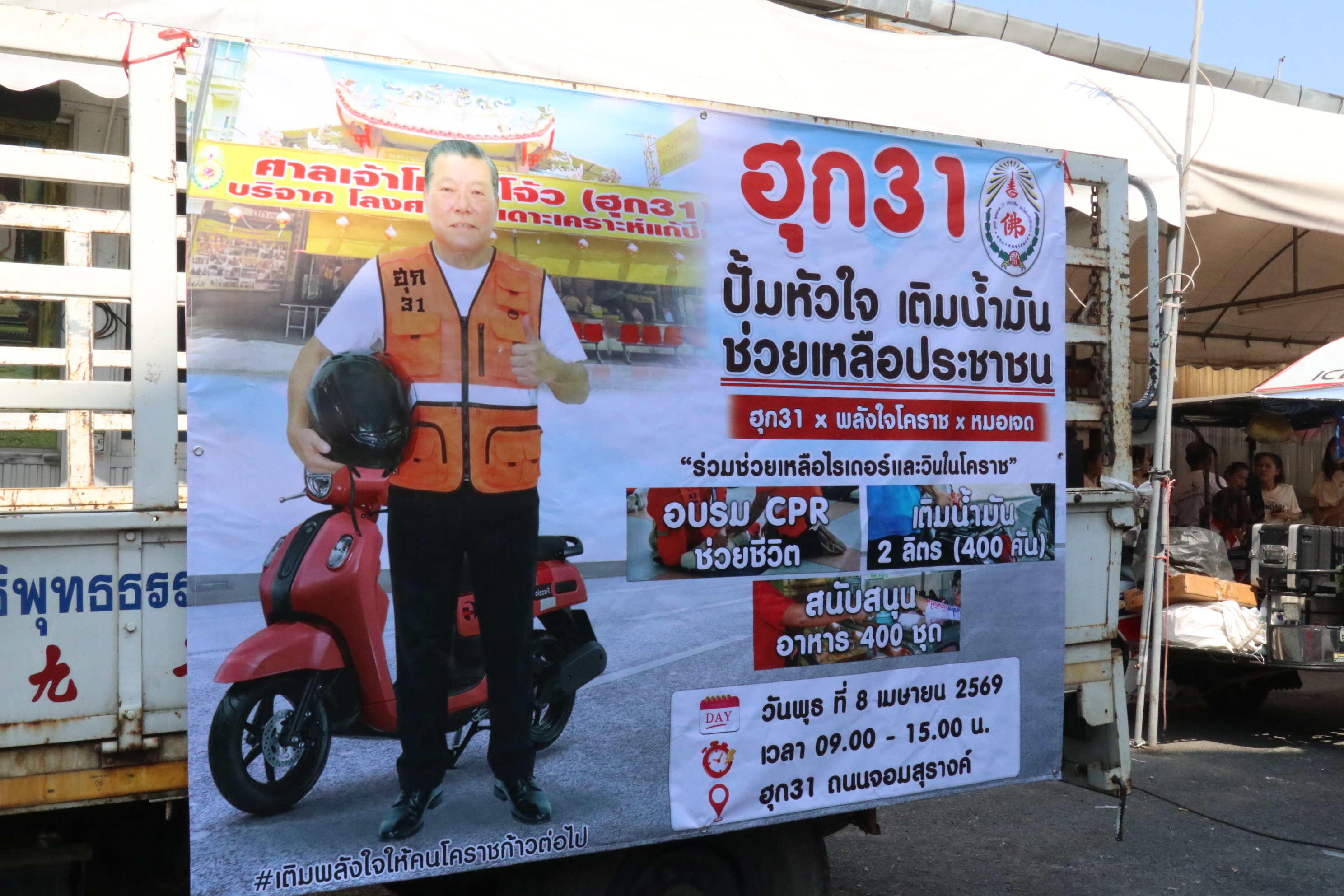 วันที่ 8 เมษายน 2569 ที่ศาลเจ้าโหงวโจ้ว ริม ถ.จอมสุรางค์ยาตร์ เขตเทศบาลนครนครราชสีมา นายประวิทย์ อัศวินชัย ประธานมูลนิธิพุทธธรรม 31 นครราชสีมา (ฮุก 31 โคราช) พร้อมด้วยนายแพทย์เจษฎ์ บุณยวงศ์วิโรจน์ รองผู้อำนวยการภารกิจด้านบริการปฐมภูมิ โรงพยาบาลมหาราชนครราชสีมา (เจ้าของสถานเสริมความงามกรวิกกาคลินิก) และภาคีเครือข่าย พลังใจโคราช ร่วมจัดโครงการปั๊มหัวใจ เติมน้ำมัน เติมน้ำใจ ให้ชาวโคราช โดยมีกลุ่มไรเดอร์ส่งอาหารและวินจักรยานยนต์รับจ้างและกลุ่มเปราะบาง จำนวน 400 คน ร่วมกิจกรรมเข้ารับการอบรมการปฐมพยาบาลเบื้องต้น พร้อมรับแจกน้ำมันเชื้อเพลิงและข้าวกล่อง รวมมูลค่าประมาณ 8 หมื่นบาท บรรยากาศค่อนข้างชื่นมื่น พบกลุ่มเป้าหมายได้มารอลงคิวตั้งแต่เช้าตรู่