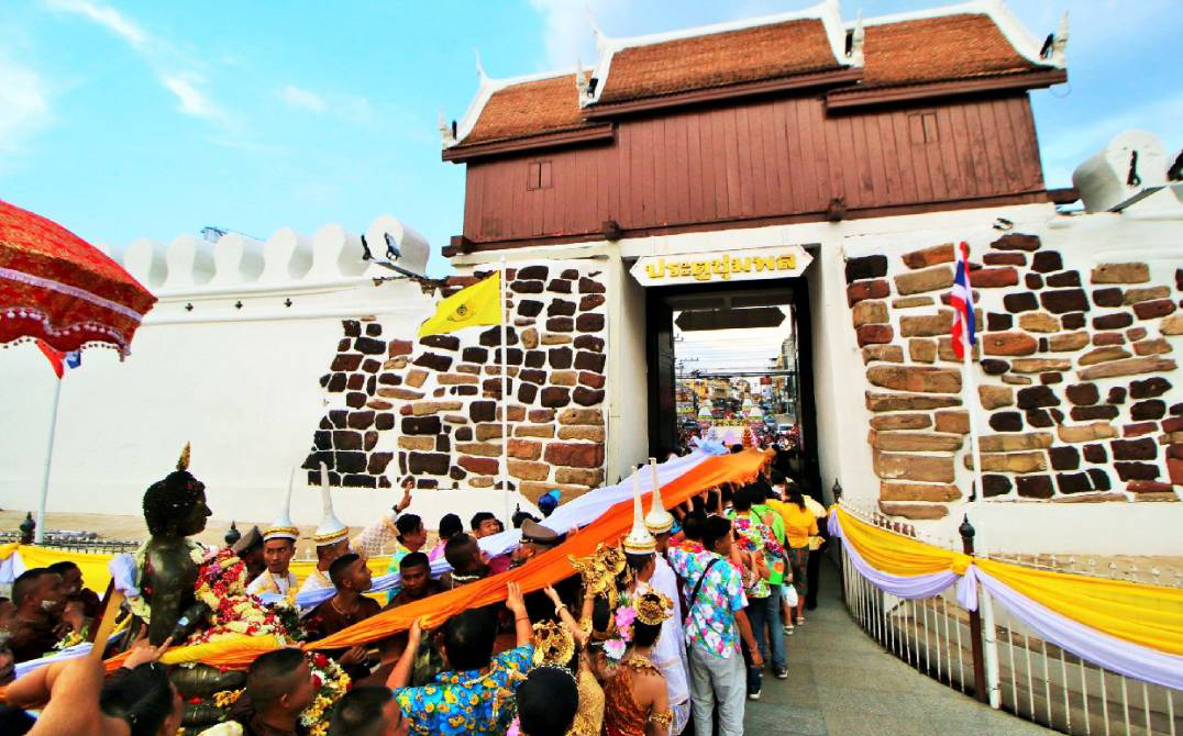 โดยงานเริ่มขึ้นในวันที่ ๑๒ เมษายน ๒๕๗๙ เวลา ๑๖.๓๐ น. จะมีพิธีอัญเชิญพระคันธารราฐออกจากพระเจดีย์ เคลื่อนลงมาบริเวณพระบรมราชานุสาวรีย์สมเด็จพระนารายณ์มหาราช ประดิษฐานบนราชรถ ร่วมขบวนแห่อัญเชิญพระคันธารราฐอันศักดิ์สิทธิ์ ซึ่งจะมีการแสดงศิลปวัฒนธรรมในริ้วขบวนแห่ พร้อมทั้งรถขบวนแห่บุปผชาติ “สงกรานต์บ้านฉัน สีสันไทไทย สุขไกลทั่วโลก” ตามเส้นทางถนนจอมพล เลี้ยวซ้ายเข้าถนนชุมพล เลี้ยวขวาเข้าถนนราชดำเนิน ไปลานอนุสาวรีย์ท้าวสุรนารี เชิญชวนชาวโคราช ร่วมสักการะพระคันธารราฐ ด้วยการโปรยดอกไม้สองข้างทางขบวนแห่อัญเชิญพระคันธารราฐ ตั้งแต่เวลา ๑๗.๐๐ น. และเดินทางถึงลานอนุสาวรีย์ท้าวสุรนารี ในเวลา ๑๘.๐๐ น. จากนั้นจะมีพิธีเจริญพระพุทธมนต์สมโภชพระคันธารราฐ ร่วมสรงน้ำพระคันธารราฐ เขียนคำอธิษฐานบนผ้าทองผ้าเงินเพื่อเสริมสิริมงคล